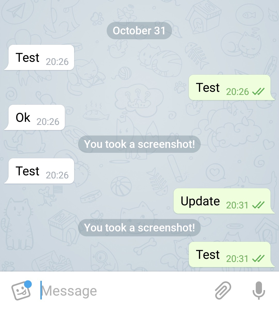 5. Buka telegram dan coba melakukan screenshot pada secret chat, maka hasilnya notifikasi “You took a screenshot!” tidak akan ada lagi 🙂