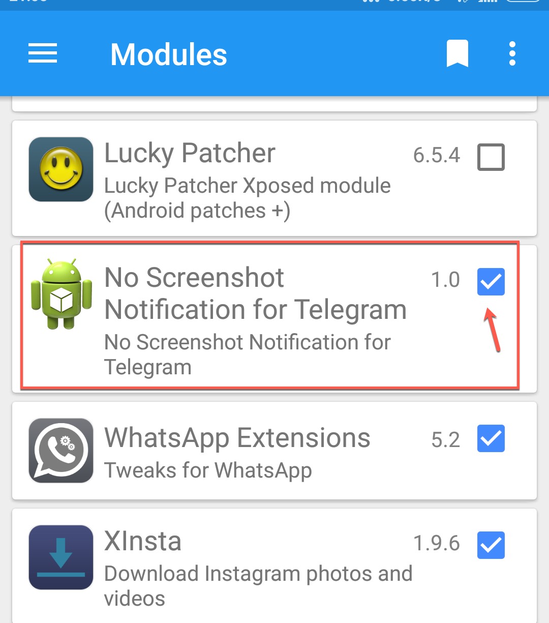 4. Buka Xposed dan Aktifkan module No Screenshot Notification for Telegram, lalu reboot Android kamu.