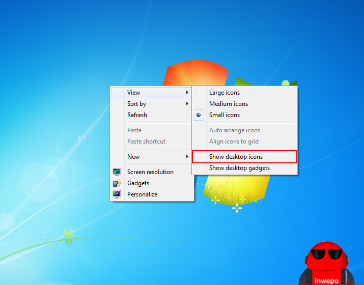 Catatan: Menu Show Desktop Icons berfungsi untuk menampilkan atau menyembunyikan ikon di Desktop windows, aktifkan Show Desktop Icons untuk menampilkan ikon Desktop, dan nonaktfikan bila ingin menghilangkan. Bila aktif, akan ada ikon centang pada menu Show Desktop Icons.