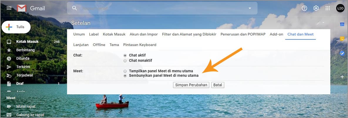 5. Di sebelah label Meet, silakan kamu pilih sembunyikan panel Meet di menu utama.