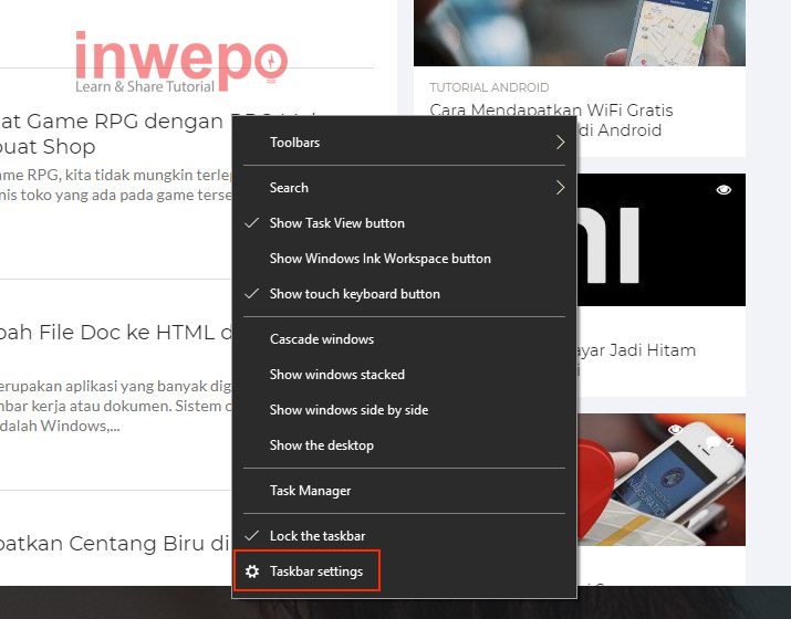 1. Klik kanan pada “Taskbar” – Klik “Taskbar Settings“.