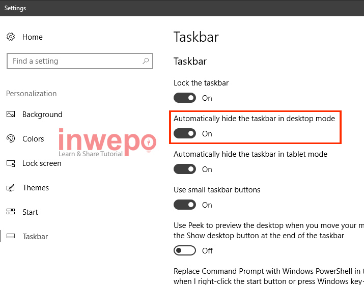 2. Aktifkan pada opsi “Automatically hide the taskbar in desktop mode” – Setelah itu “Taskbar” pada komputer atau laptop kamu akan hilang (Bila ingin memunculkan kembali “Taskbar” arahkan kursor ke arah bawah pada layar komputer atau laptop kamu dan “Taskbar” akan muncul).