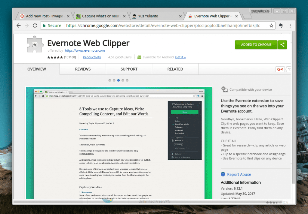 2. Jika sudah memiliki akun Evernote, selanjutnya pasanglah ekstensi Evernote Web Clipper di Chrome Web Store.