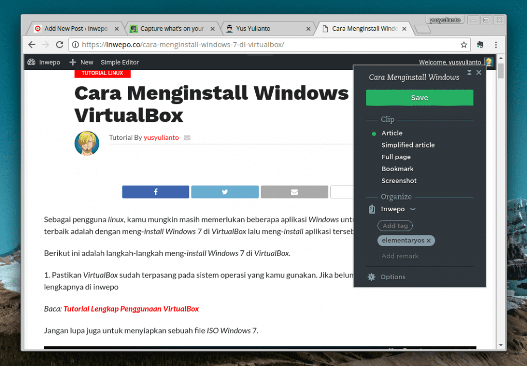 3. Sekarang, akan ada logo bergambar gajah di sebelah kanan atas peramban kamu. Setiap kali kamu menemukan artikel menarik, klik logo tersebut lalu klik tombol save. Maka artikel akan tersimpan di Evernote kamu.