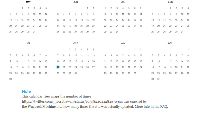 7. Setelah kamu klik Browse History, maka akan muncul bulatan berwarna biru pada tanggal 21 Oktober. Dan bulatan tersebut adalah bukti bahwasanya link kontroversial berhasil disimpan dan tidak akan pernah hilang dari internet. Kamu bisa klik bulatan tersebut, dan status kontroversial yang sudah kamu simpan akan muncul.
