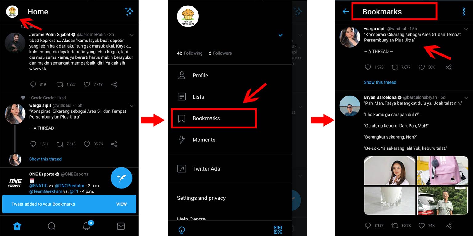 5. Selesai, untuk melihat utas yang tersimpan, kamu tinggal klik menu profil seperti gambar di bawah ini kemudian klik bookmarks dan utas akan otomatis masuk ke bookmarks twitter.