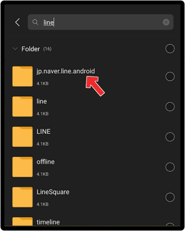 2. Setelah itu buka file manager, kemudian pada folder pencarian ketikkan kata “LINE”. Lalu akan muncul beberapa hasil penelusuran seperti di bawah ini. Pilih folder “jp.naver.line.android”.
