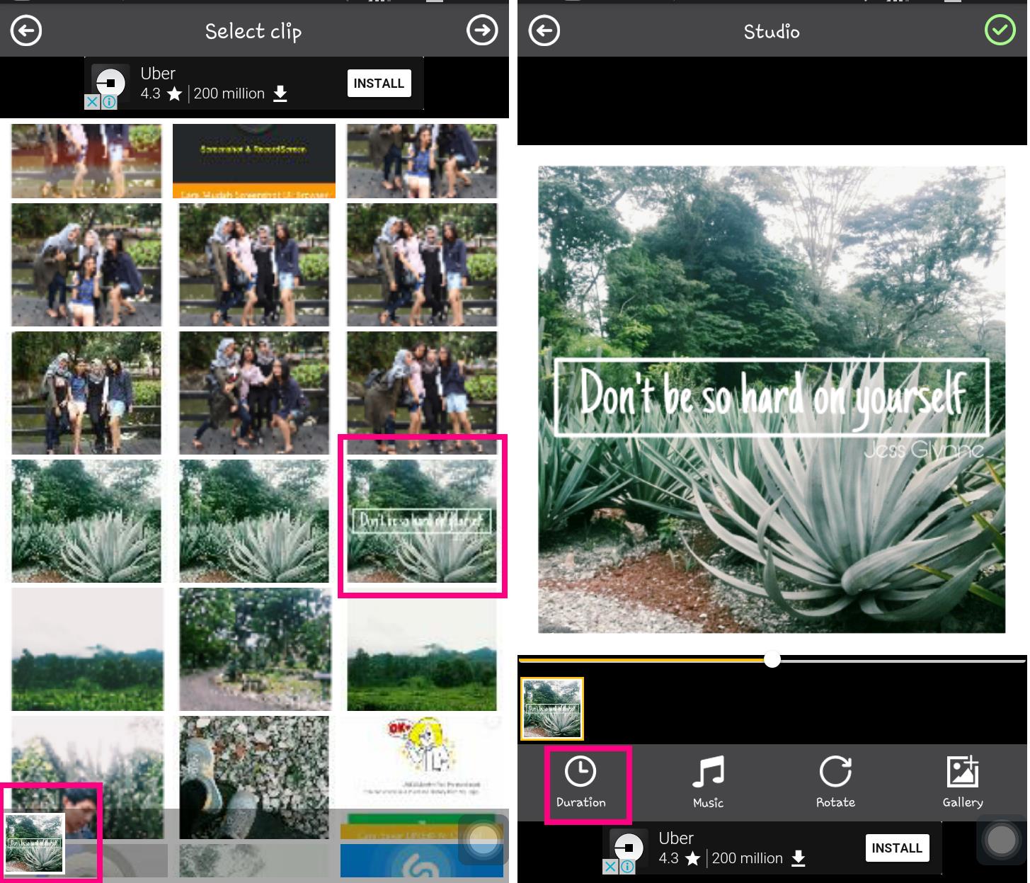 4. Masuk pada menu studio, kamu diminta untuk mulai mengatur durasi foto yang nantinya akan di sisipkan musik pada foto tersebut, Tap pada menu duration.