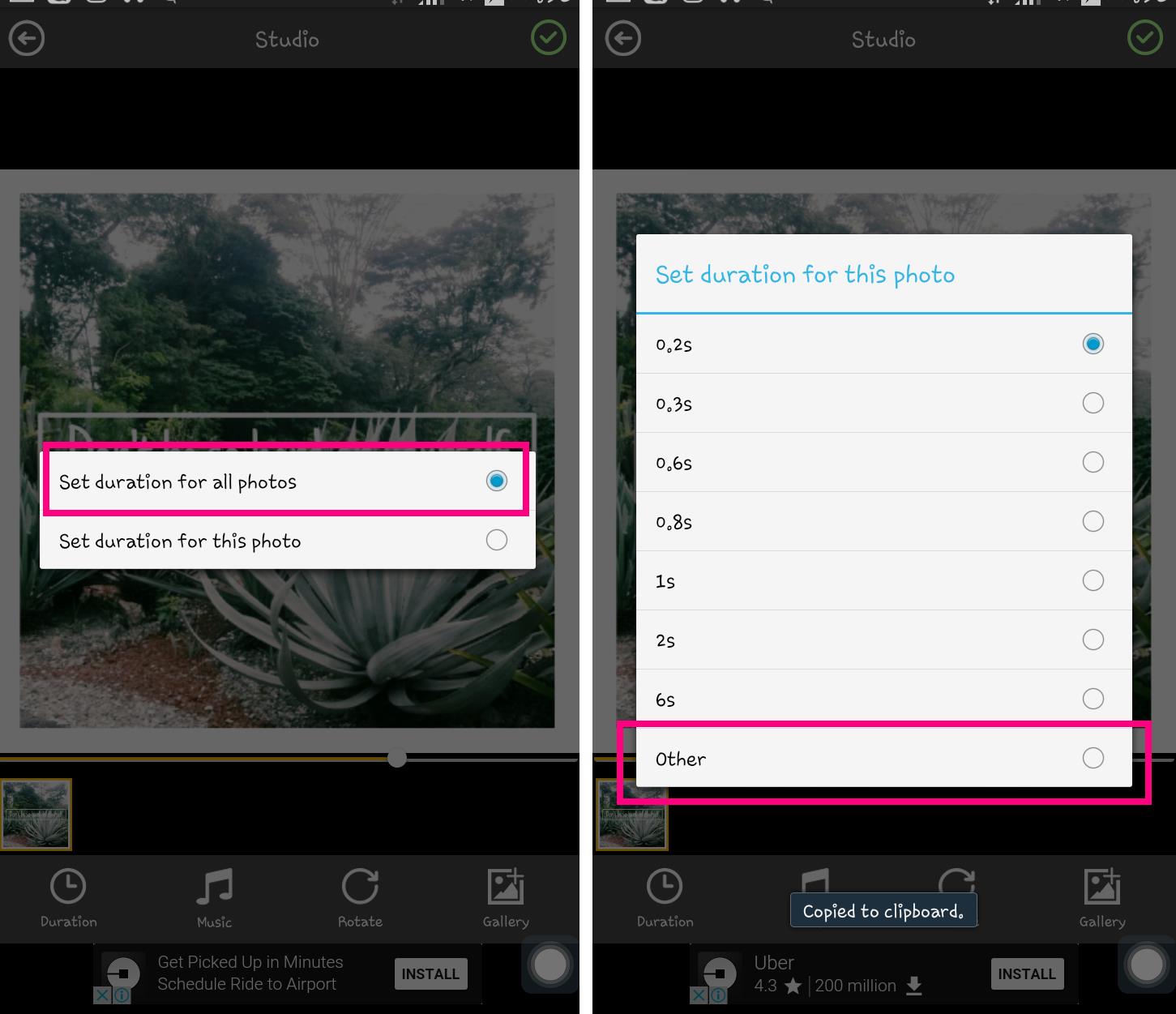 5. Pada menu duration – pilih dan tap pada pilihan set duration for all photos. kamu bisa pilih duration kamu sesuai keinginan kamu atau dengan tap pada others kamu bisa mengetikkan duration sesuai yang kamu inginkan namun tidak lebih dari 30sec.