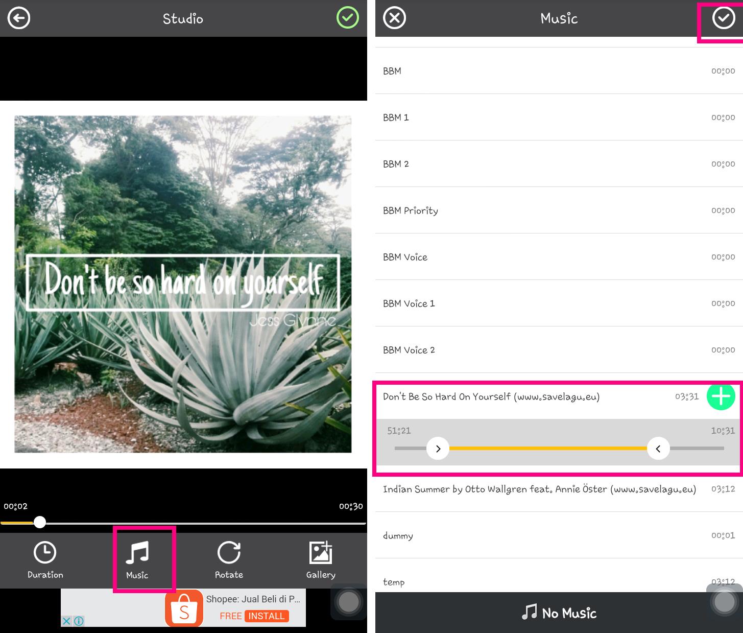 8. Atur musik dengan menggeser seperti contoh di bawah ini, jika sudah di atur sesuai keinginan – tap icon (+), kemudian tap icon ceklist yang berada di pojok kanan atas.