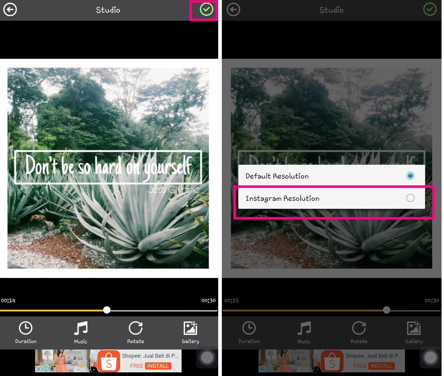 10. Ada 2 pilihan dalam menyimpan hasilnya, jika kamu ingin hasil ini kamu upload ke instagram bisa langsung pilih dan tap pada pilihan instagram resolution.