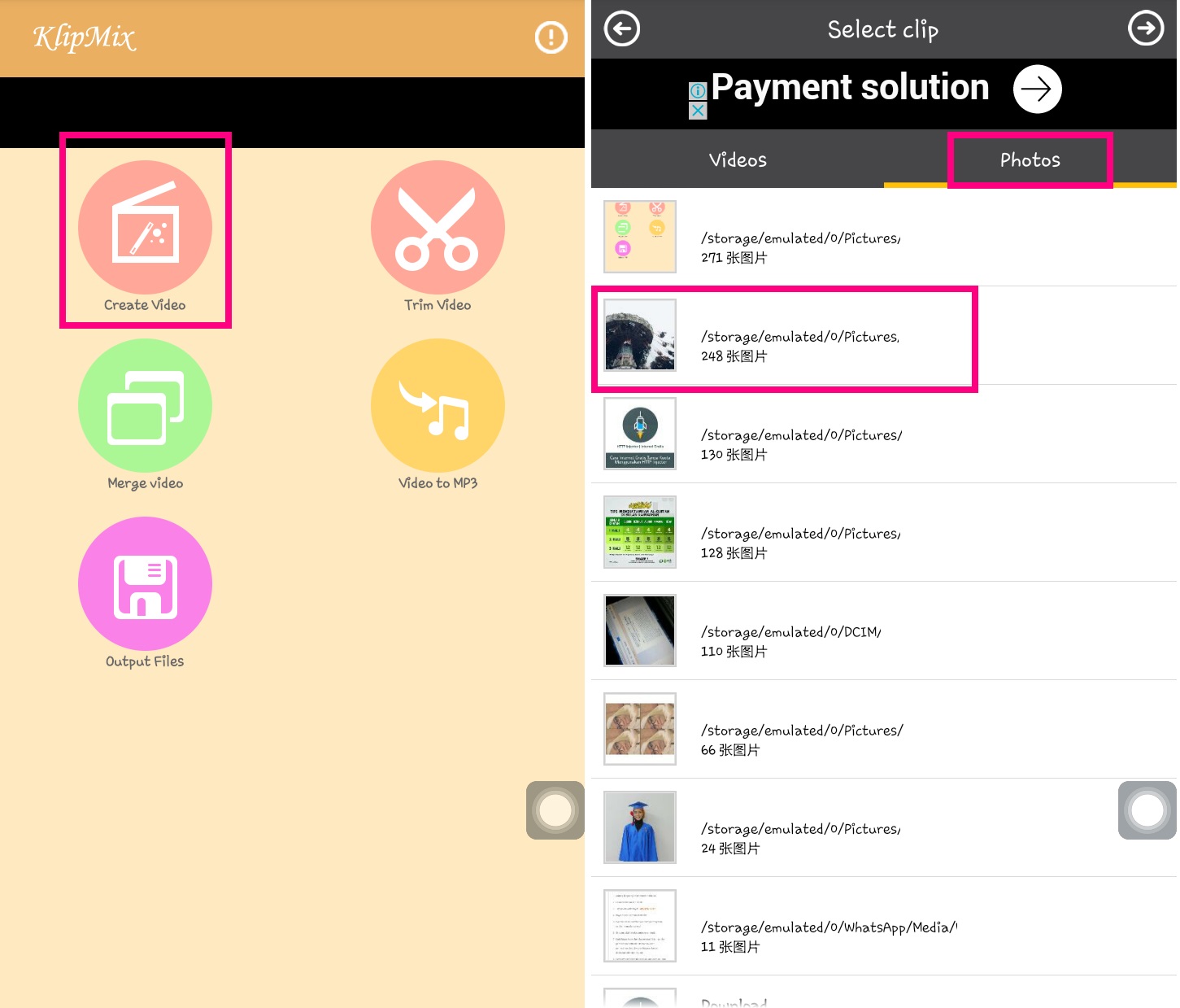 2. Buka aplikasi Klipmix di smartphone kamu, lalu Tap create video – pada menu select clip akan muncul folder yang ada di galery kamu, lalu kamu tap salah satu folder tersebut.