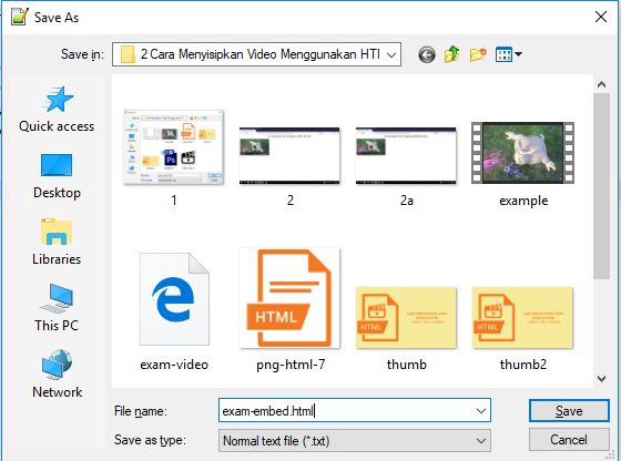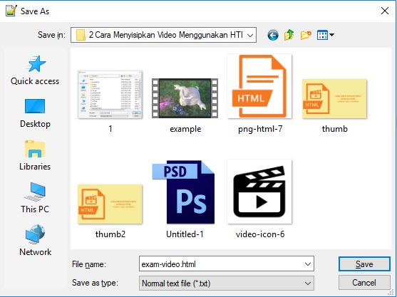4. Pilihlah tempat simpan sesuai keinginan kamu, berikan nama “exam-video.html”.