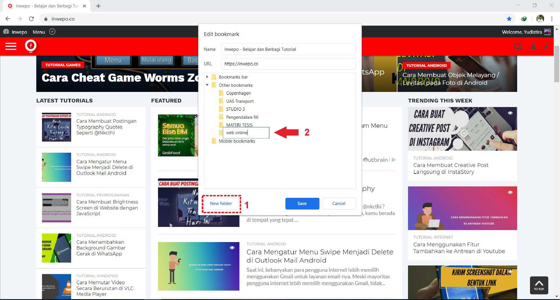 4. Ketik nama folder yang ingin dibuat (disini penulis mencontohkan nama folder web online). Jika sudah klik save.