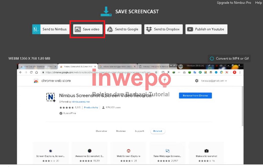 Aplikasi yang biasa digunakan oleh pengguna internet rata-rata pasti menggunakan bandicam atau camstasia, tapi apakah kalian tahu bahwa masih banyak aplikasi screen recorder bagus lainnya, bahkan ada sebuah ekstensi Google Chrome yang bisa melakukan screen recording dengan hasil yang tidak kalah bagus dengan menggunakan kedua aplikasi tadi, namanya Nimbus Screenshot & Screen Video Recorder.