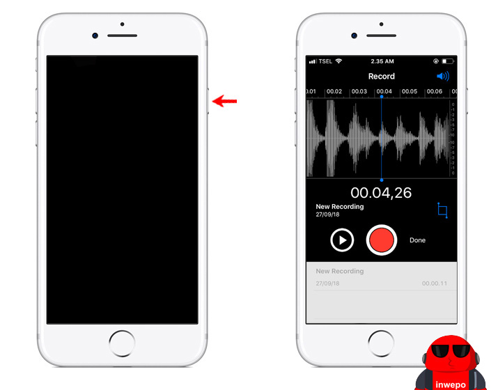 3. Setelah selesai merekam suara, aktifkan kembali iPhone dengan menekan Tombol Daya (Power Button) – ketika iPhone aktif, proses perekaman sedang berjalan.