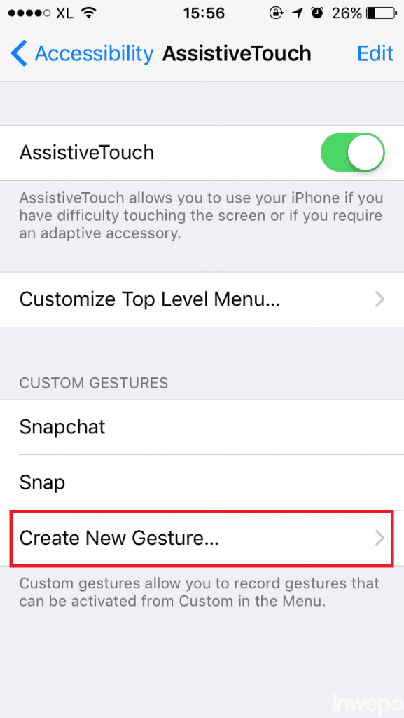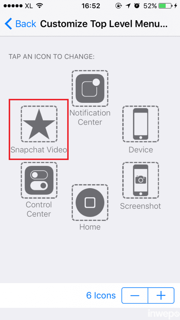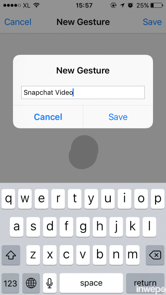 8. Langkah terakhir adalah mencoba gesture, buka aplikasi Snapchat, lalu ke bagian record video, buka AssistiviveTouch dan pilih gesture yang telah diatur pada langkah 7. Arahkan titik gesture kebagian record seperti pada gambar di bawah ini :