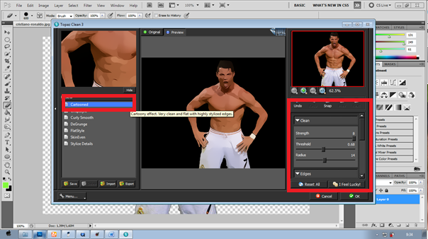 jadikan layer background seperti kartun dengn cara klik Filter > Topaz Lab > Topaz Clean 3, atur nilainya sesuai gambar.