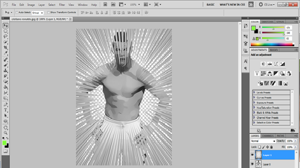 Satukan layer background dengan layer utama, kemudian atur levelnya klik Image > Adjusment > Level atau dengan menekan Ctrl+L, sesuaikan nilainya.