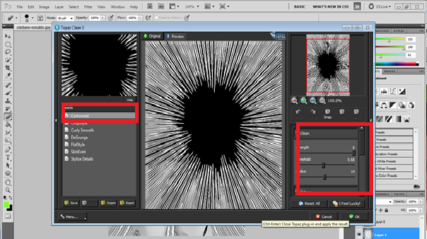 Klik Filter – Topaz Clean3 – Cartooned, dan sesuaikan nilainya.