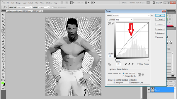Atur curves dengan cara klik Image – Adjusment – Curves, sesuaikan nilainya.