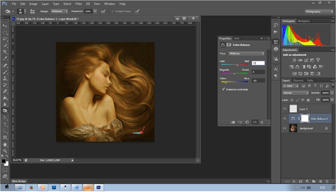 Finishing yaitu dengan pemberian warna, masuk ke Adjusmen Layer dan pilih Collor Balance atur nilainya seperti di bawah.
