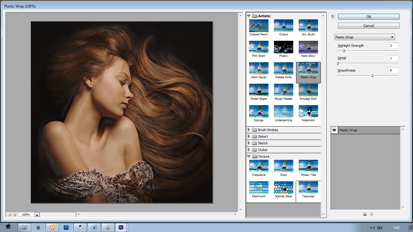 Pilih Filter – Filter Galery – Artistic – Plastic Wrap. Atur nilainya seperti gambar di bawah ini.
