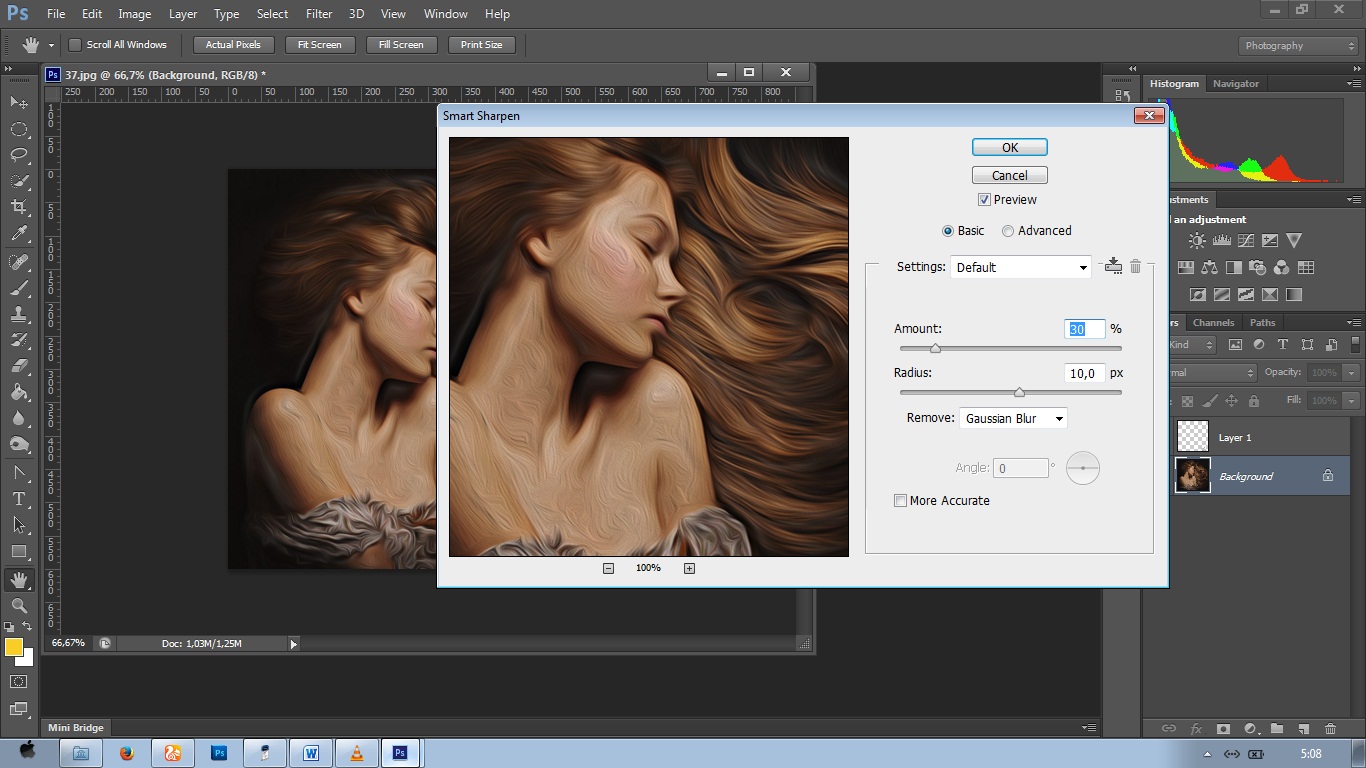 Masuk Lagi Ke Filter – Sharpen – Smart Sharpen. Atur nilainya seperti gambar di bawah.