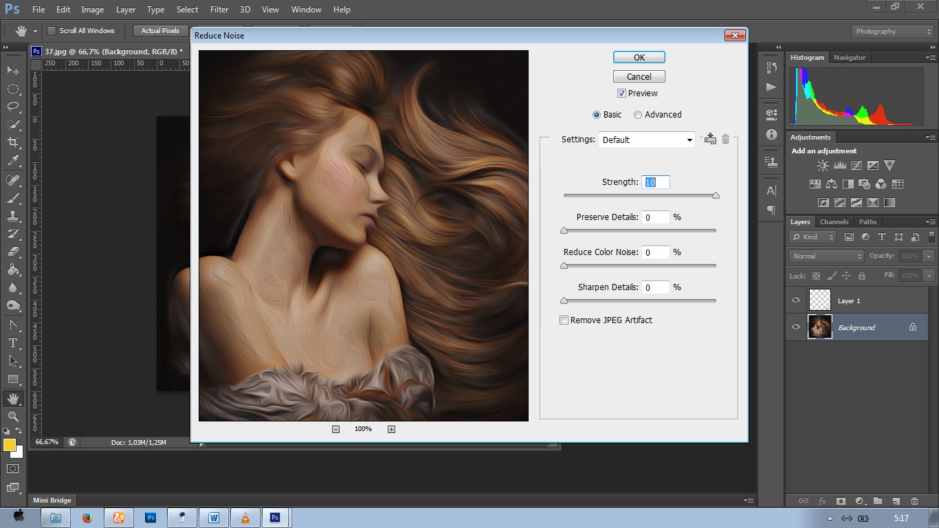 Masuk Ke Filter – Noise – Reduce Noise. Atur nilainya seperti gambar.