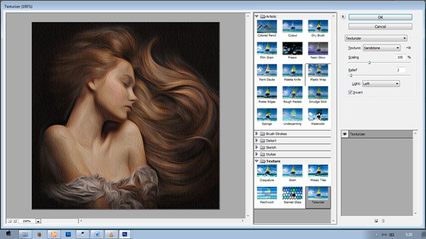 Untuk menambah efek lukisan Agar semakin terlihat realis tambahkan efek texture yaitu masuk ke Filter – Filter Galery – Texture – Texturizer. Atur nilainya seperti di gambar.