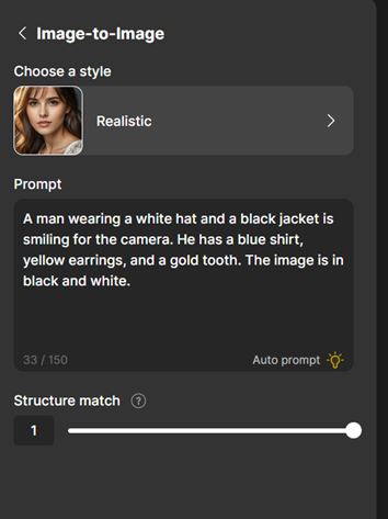 6. Setelah itu pilih menu Image-to-Image. Atur Structure math hingga full ke angka 1, jangan lupa untuk gunakan Auto prompt. Untuk stylenya pilih saja Realistic. Klik tombol Stylarize, dan tunggulah proses yang ada.