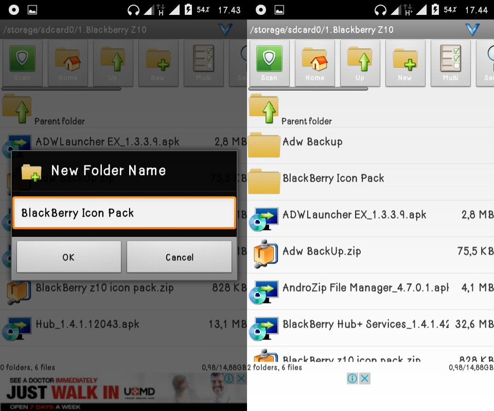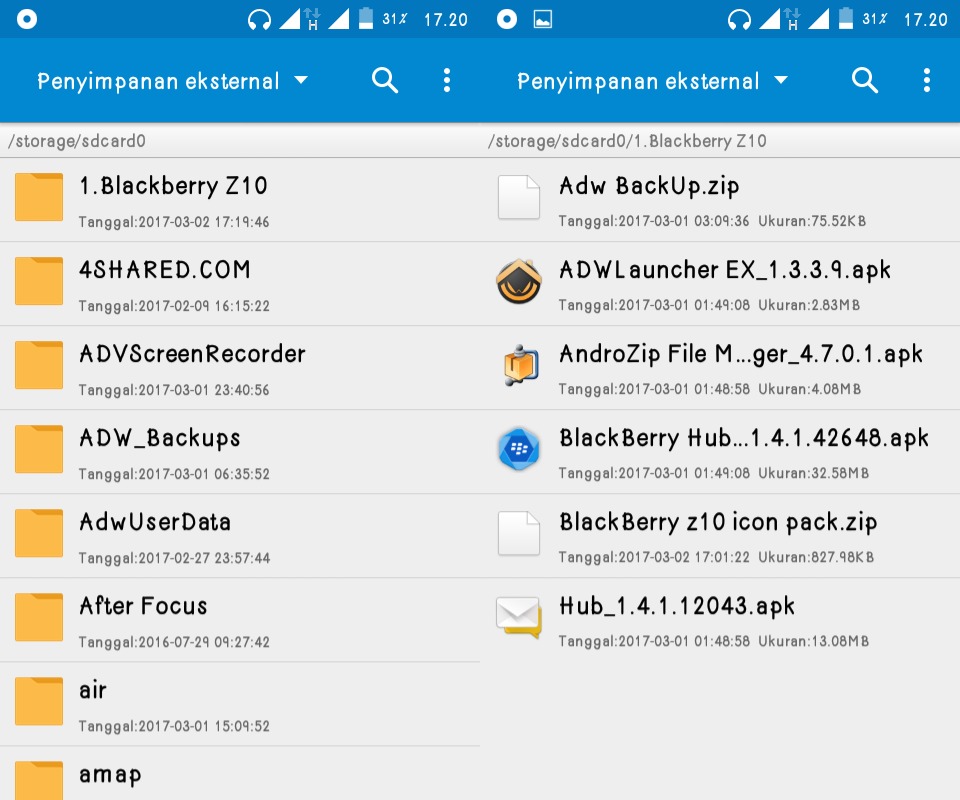 4. Buka aplikasi AndroZip, lalu buat dua folder baru dalam satu folder aplikasi tadi dengan nama “Blackberry Icon Pack” dan “Adw BackUp“. Lalu extract file zip tadi kedalam folder masing-masing yang sudah di buat.
