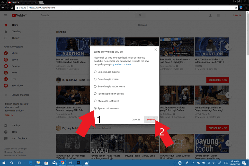 3. Kamu akan diminta alasan mengapa ingin meninggalkan tampilan YouTube terbaru, klik saja pada āI prefer not to answerā lalu klik āSubmitā.
