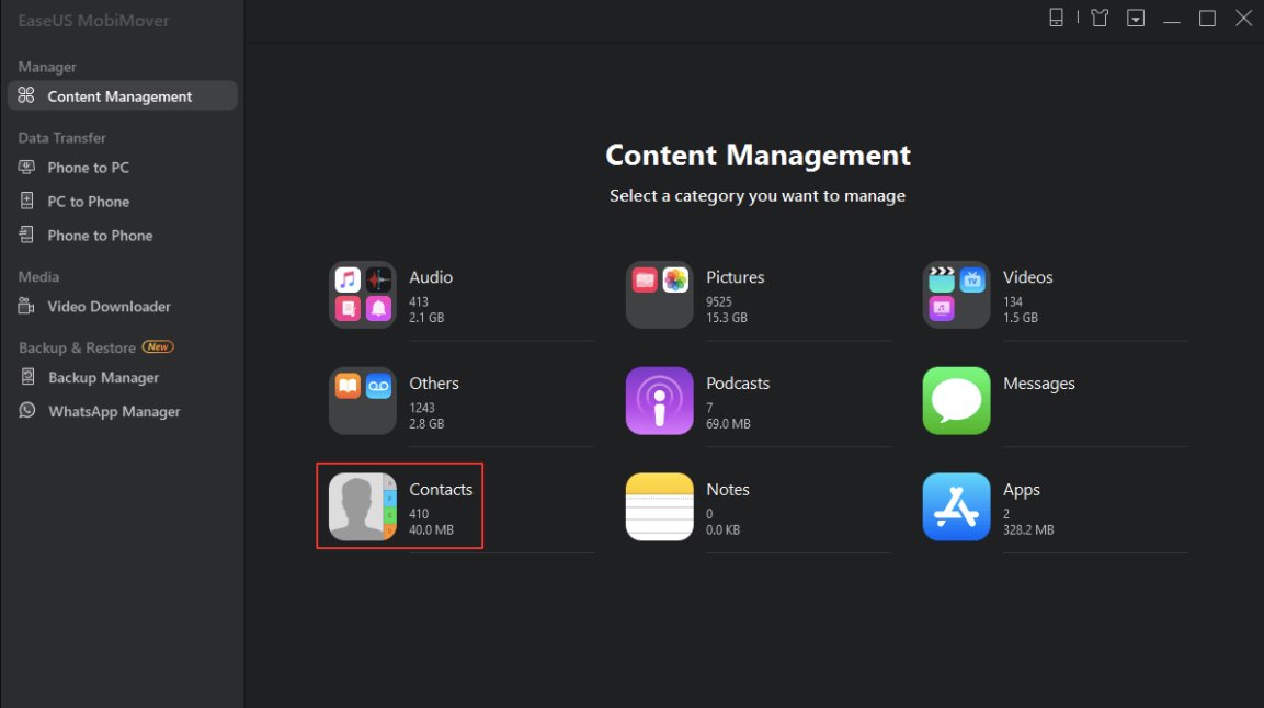2. Hubungkan iPhone ke komputer PC/Laptop kamu dan jalankan EaseUS MobiMover. Pastikan kamu telah mengizinkan komputer kamu di iPhone kamu, lalu buka menu Content Management – Pilih Contacts.