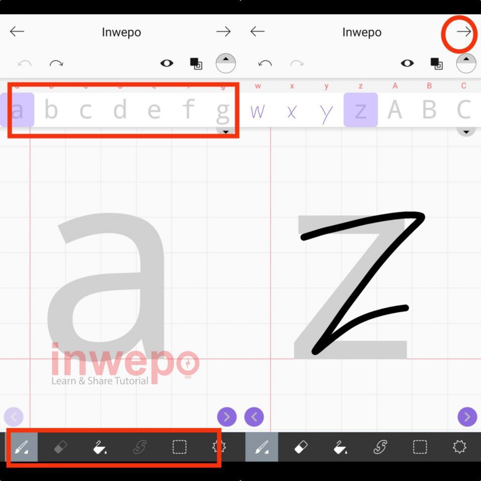 3. Nantinya akan ada template huruf yang bisa kalian jadikan acuan, gunakan menu di bawah untuk mengambar font. Jangan lupa menyelesaikan semua template mulai dari A sampai Z dan jika sudah tap icon arrow yang ada di bagian kanan atas.