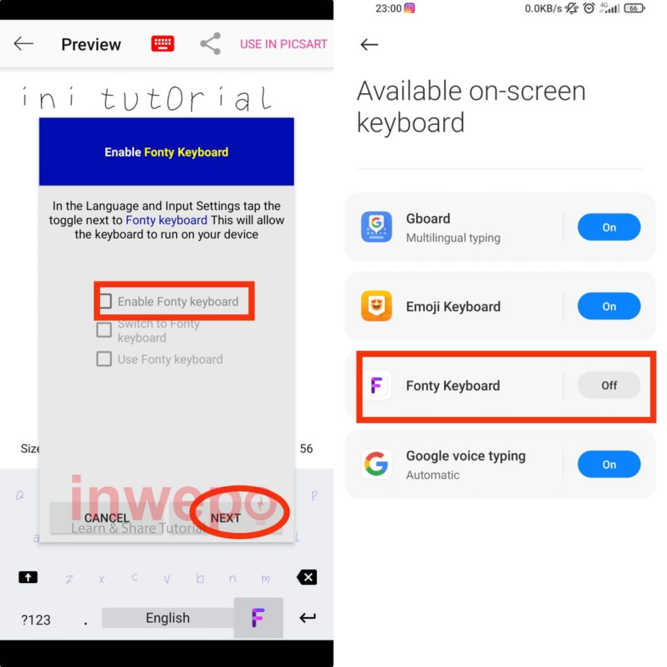 4. Tampilan previewnya seperti gambar di bawah ini. Untuk menggunakannya sebagai keyboard kalian bisa tap icon keyboard yang ada di bagian atas. Lalu tap menu Next.