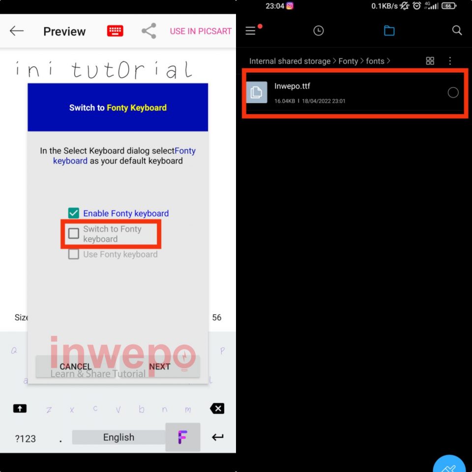 6. Terakhir ceklis dua menu selanjutnya yakni switch dan use fonty keyboard. Untuk membagikan font buatan km sendiri langsung masuk ke file manager lalu buka folder font di fonty. Selanjutnya kalian bisa membagikan file font tersebut ke aplikasi yang lain.