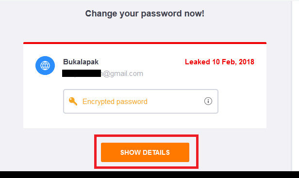 4. Hasil pemeriksaan akan dikirim melalui email. Buka email. Tenyata email dan password saya bocor di akun bukalapak. Klik tombol show detail untuk melihat lebih rinci kapan password bocor.