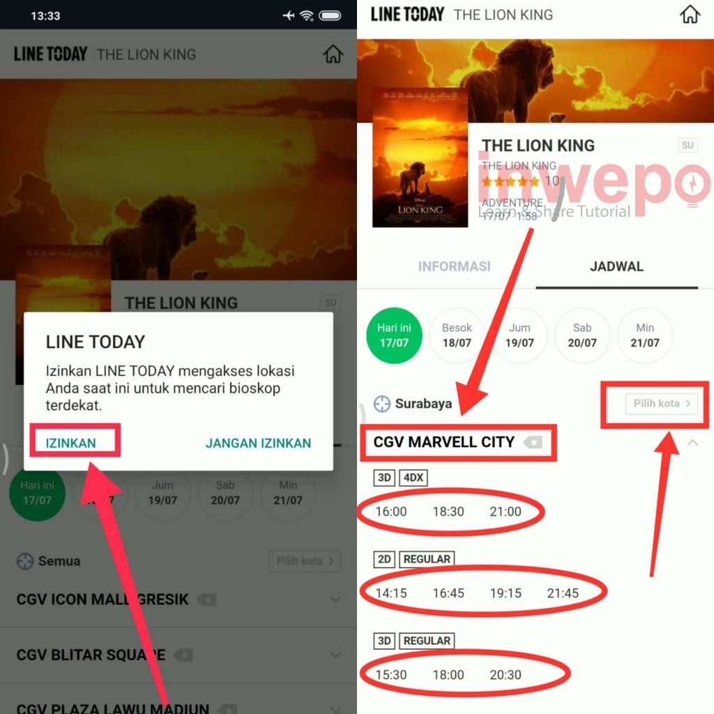5. Tap IZINKAN untuk mengizinkan aplikasi mengakses lokasi, selanjutnya pilih menu pilih kota untuk memilih bioskop yang ada di kota mu. Tap pada bioskop favorit kamu untuk melihat jadwal tayang dari film yang akan di putar.