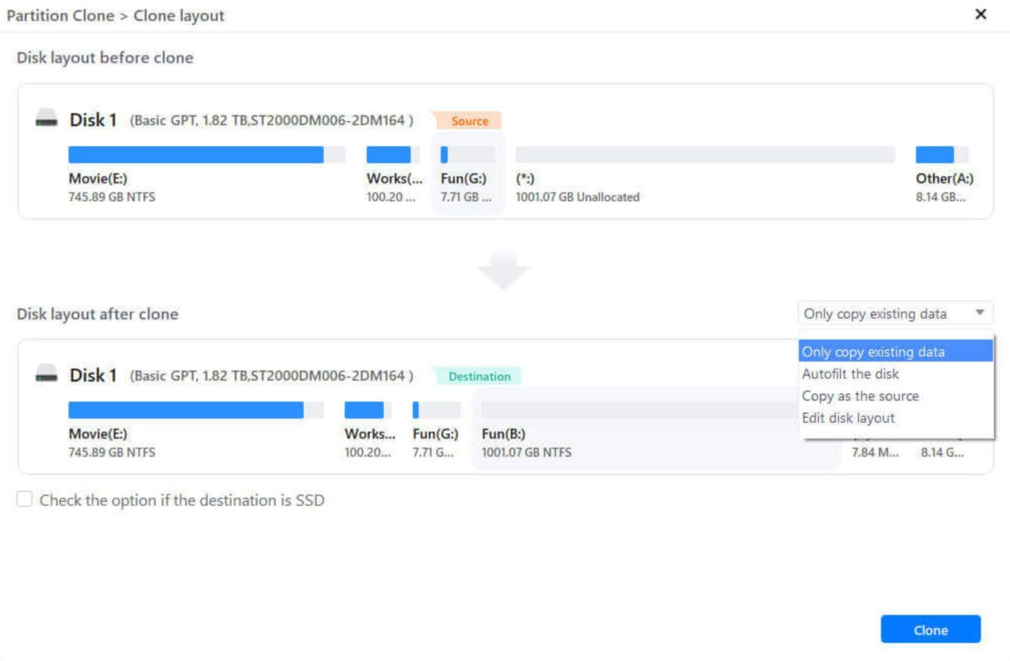 - Copy as the source: jangan ubah apa pun di partisi tujuan dan tata letaknya sama dengan partisi sumber.