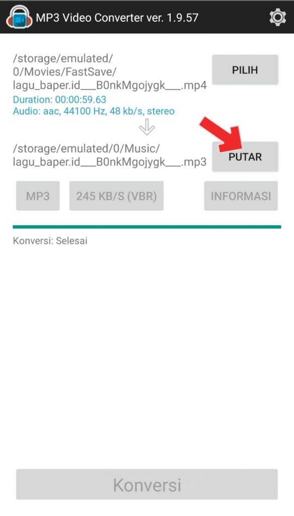 6. Setelah prosesnya 100% kemudian pilih putar untuk mencoba memutar audio MP3 yang telah berhasil di convert.