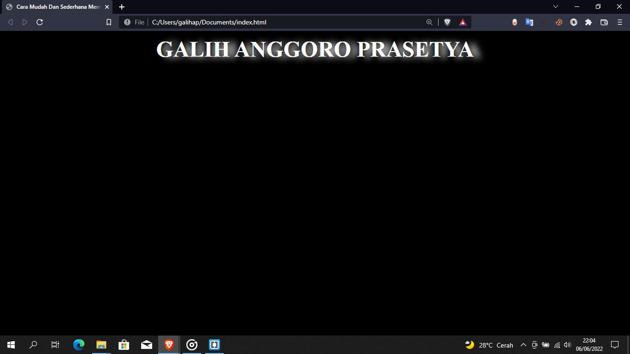 Penulis membuat struktur html, di mana di dalam tag <body> </body> terdapat tag <h1>GALIH ANGGORO PRASETYA</h1> nah maksud ini adalah untuk contoh membuat efek bayangan dengan nama penulis untuk bisa di tampilkan nanti di dokumen html. Ouh ya pada baris 4 terdapat tag <link rel=”stylesheet” href=”style.css”> di mana ini untuk memanggil file css nya.