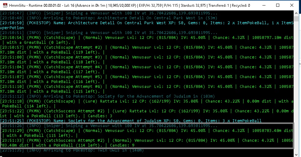 [22:00:16] (INFO) Current Pokeballs: 35 | Greatballs: 52 | Ultraballs: 6 | Masterballs: 0