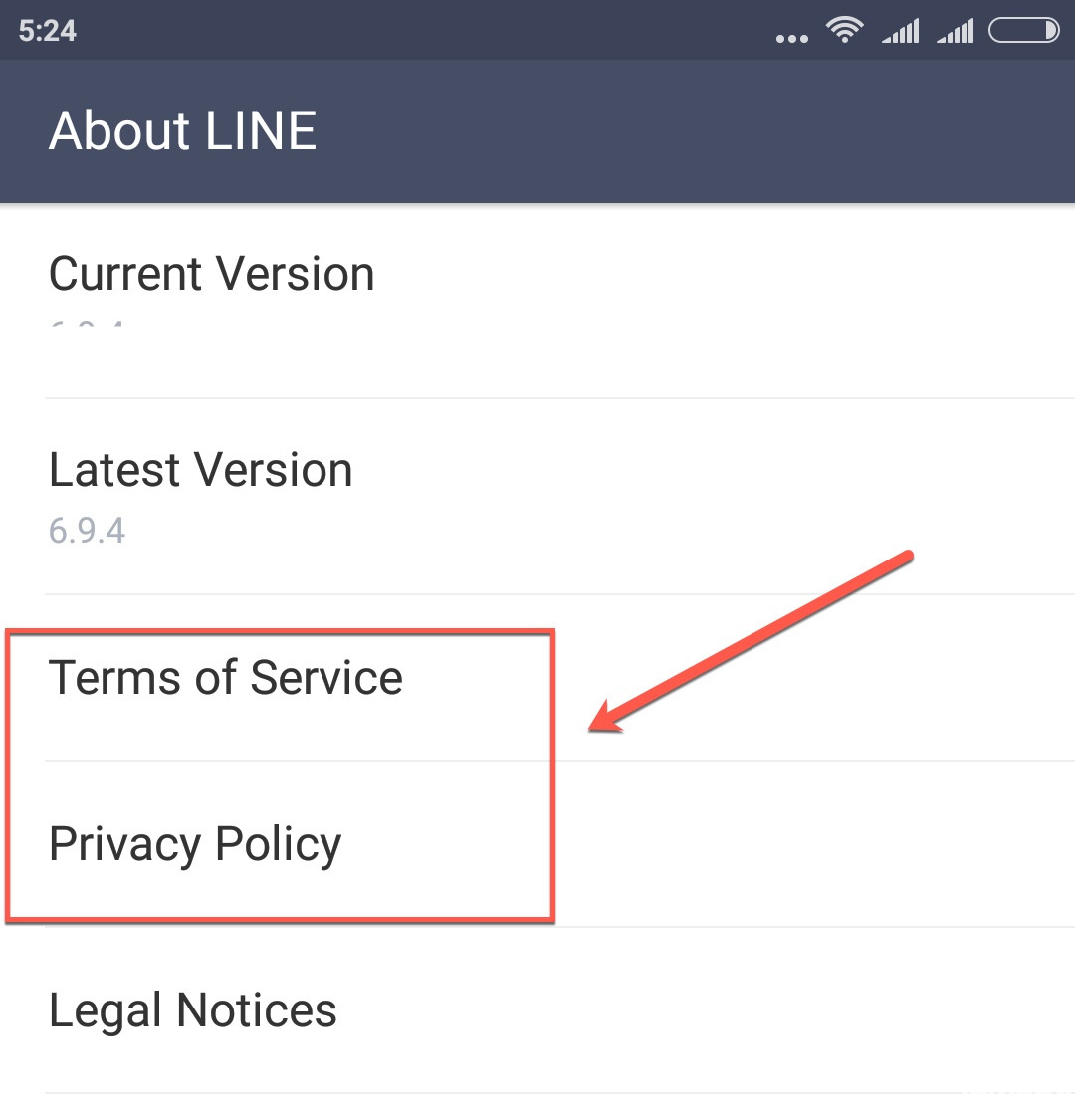 5. Buka LINE lalu masuk ke Settings – About LINE – Terms of Service/Privacy Police. Nanti akan terlihat menu Theme Test!.