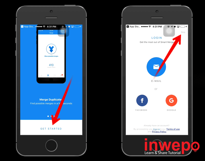 2. Buka aplikasi Smart Merge – Tap GET STARTED – di menu LOGIN Tap Skip.