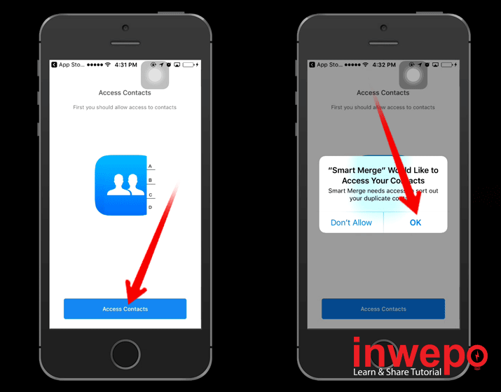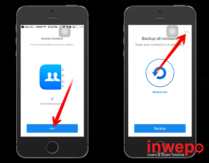3. Tap Access Contacts – Tap OK – Next – untuk Backup Contacts sesuai keinginan, mau di Backup atau Skip.
