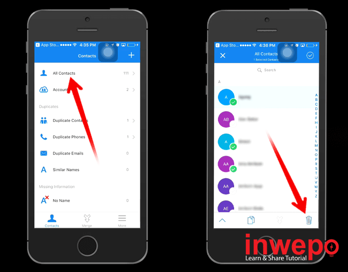 4. Masuk All Contacts – Tap dan tahan untuk menandai beberapa kontak yang ingin dihapus.