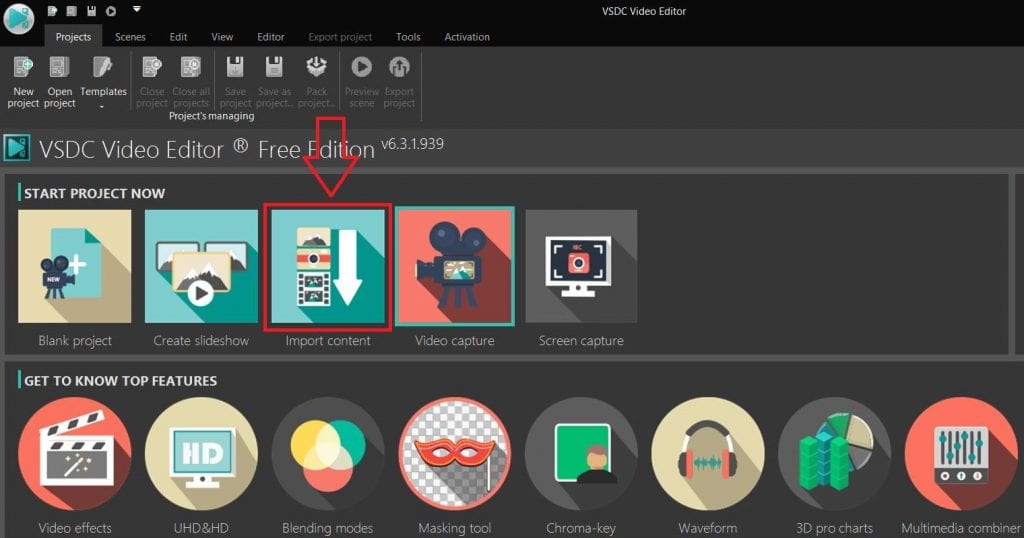 3. Berikut ini adalah merupakan sebuah tampilan awal dari VSDC, karena disini penulis akan memberikan sebuah tutorial mengenai cara import video. Tentunya yang kamu lakukan adalah silahkan pilih import Content.
