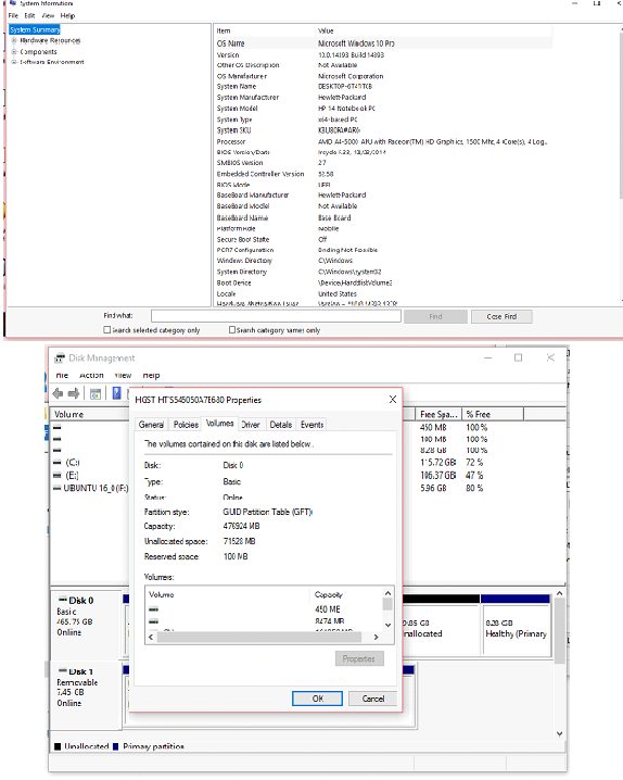 1. Lakukan pengecekan bios mode terlebih dahulu dengan menekan windows+R dan mengetik msinfo32. Setelah itu cek tipe partisi pada laptop dengan disk management.