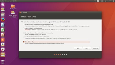 7. Kemudian melakukan pilihan installation type dan pilih something else dan klik continue.